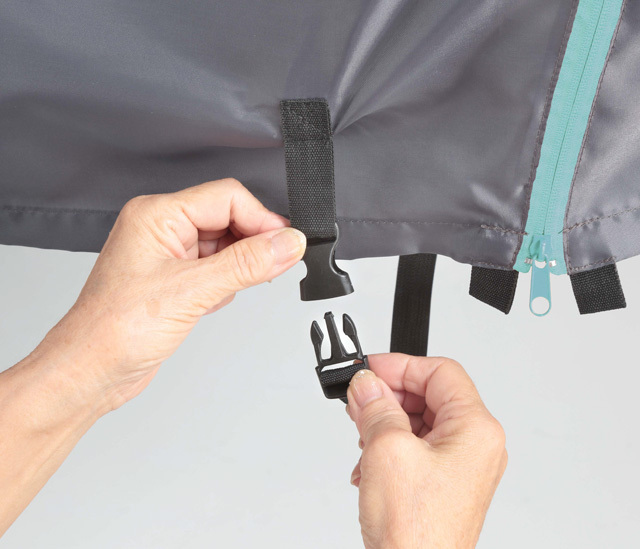 ・ファスナーを開けた際に裾を持ち上げて固定するワンタッチバックル付き