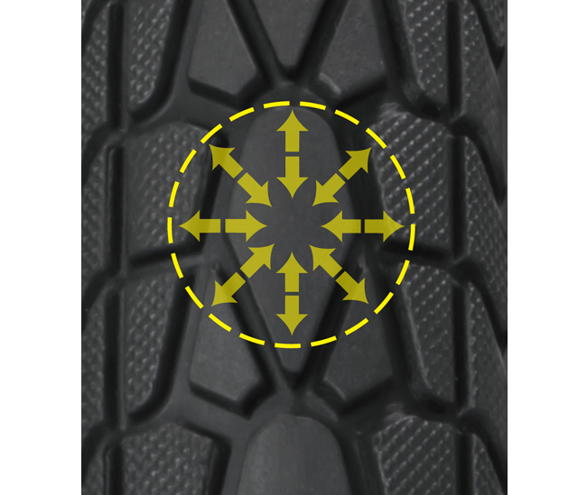 ・トレッドパターンは、センターの独立ブロックが接地面に対してしなやかに動くことでグリップ力と乗り心地を向上させ、サイドの表面シボ加工がコーナーリング時のスリップを抑制し、快適で安定した走行を実現