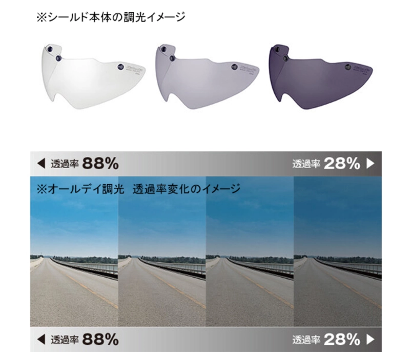 ・シールドの濃度が最も薄い状態で可視光線透過率88%から最も濃い状態で28%となり、1枚のシールドで交換の手間なく幅広いコンディションをカバー