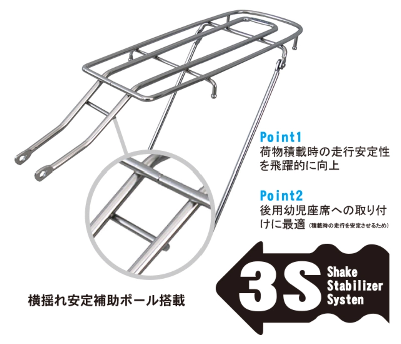 ・荷物積載時の走行安定性を飛躍的に向上させ、幼児座席の取り付けにも最適な3S(Shake Stabilizer System:横揺れ安定補助ポール)搭載