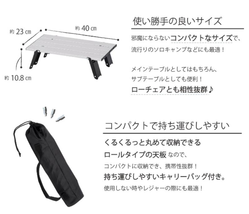 ・天板はロールタイプでくるくると丸めてコンパクトに収納することが可能・持ち運びに便利な収納袋付き