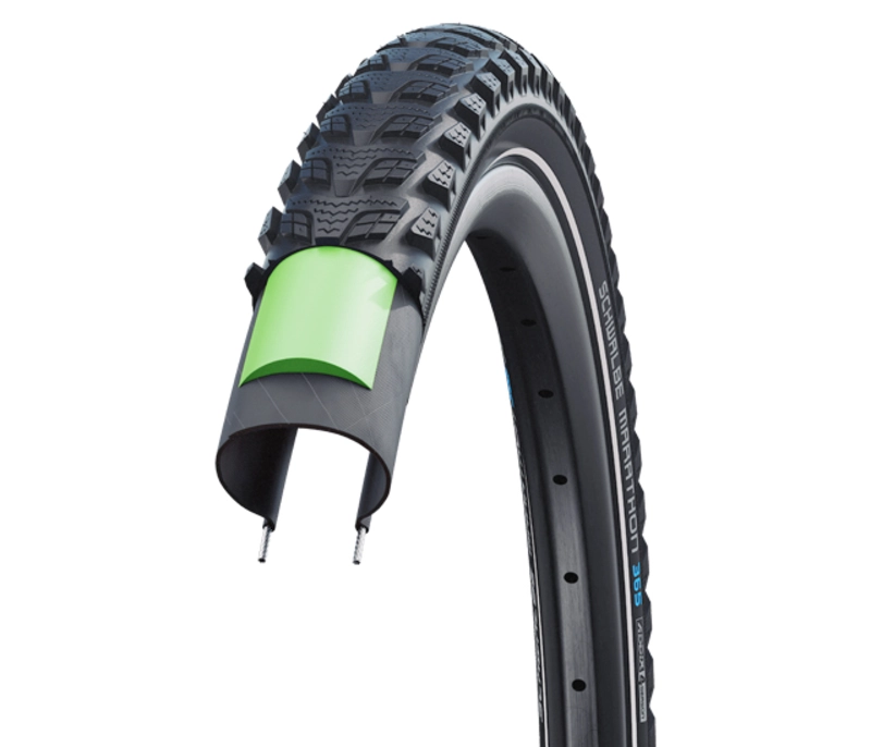 ・耐パンクベルトのグリーンガードは3mm厚のプロテクションベルトを用いたレイヤーでリサイクルラバーを1/3使用